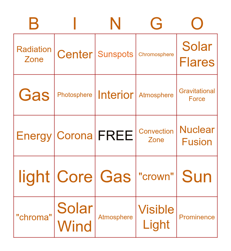 This bingo card has a free space and 24 words: Core, Solar Wind, Interior, "chroma", Solar Flares, Radiation Zone, Gas, Center, Convection Zone, Gas, Atmosphere, Energy, "crown", Sun, Photosphere, Visible Light, Nuclear Fusion, Sunspots, Gravitational Force, Corona, Prominence, light, Chromosphere and Atmosphere.