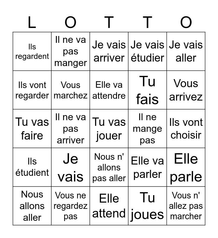 This bingo card has 25 words: Je vais, Elle attend, Elle va attendre, Nous allons aller, Je vais aller, Ils regardent, Ils vont regarder, Il ne va pas manger, Il ne mange pas, Nous n' allons pas aller, Tu fais, Tu vas faire, Elle va parler, Elle parle, Vous marchez, Vous n' allez pas marcher, Ils vont choisir, Je vais arriver, Vous arrivez, Il ne va pas arriver, Tu vas jouer, Vous ne regardez pas, Ils étudient, Je vais étudier and Tu joues.