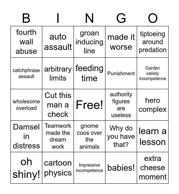 This bingo card has a free space and 26 words: gnome coos over the animals, babies!, feeding time, cartoon physics, tiptoeing around predation, fourth wall abuse, catchphrase assault, auto assault, hero complex, Why do you have that?, Punishment, wholesome overload, learn a lesson, oh shiny!, Cut this man a check, this was your fault, made it worse, Damsel in distress, groan inducing line, extra cheese moment, Garden variety incompetence, Impressive incompetence, authority figures are useless, Teamwork made the dream work, arbitrary limits and Unnecessary villain.