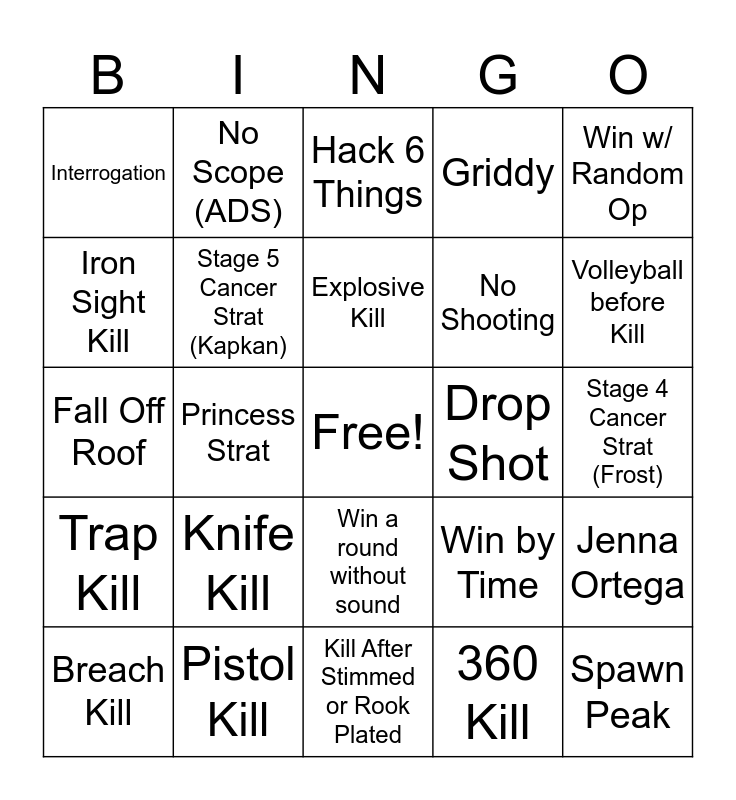This bingo card has a free space and 24 words: Knife Kill, Pistol Kill, Explosive Kill, Breach Kill, Win w/ Random Op, Interrogation, Iron Sight Kill, No Scope (ADS), Drop Shot, Win a round without sound, No Shooting, Fall Off Roof, Win by Time, Jenna Ortega, Stage 5 Cancer Strat (Kapkan), 360 Kill, Stage 4 Cancer Strat (Frost), Hack 6 Things, Volleyball before Kill, Princess Strat, Spawn Peak, Trap Kill, Griddy and Kill After Stimmed or Rook Plated.