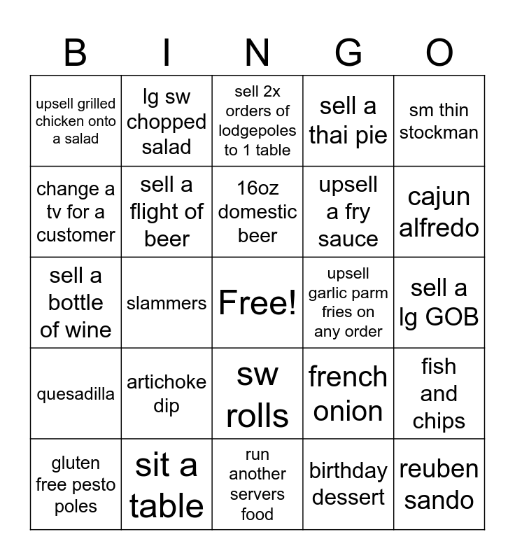 This bingo card has a free space and 24 words: gluten free pesto poles, artichoke dip, 16oz domestic beer, birthday dessert, sm thin stockman, upsell grilled chicken onto a salad, lg sw chopped salad, sell 2x orders of lodgepoles to 1 table, upsell garlic parm fries on any order, sell a lg GOB, sell a bottle of wine, sell a flight of beer, french onion, fish and chips, change a tv for a customer, sit a table, run another servers food, sell a thai pie, cajun alfredo, quesadilla, slammers, sw rolls, upsell a fry sauce and reuben sando.