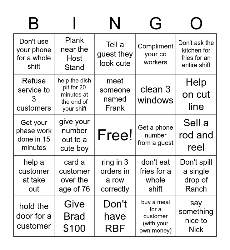 This bingo card has a free space and 24 words: hold the door for a customer, card a customer over the age of 76, meet someone named Frank, buy a meal for a customer (with your own money), Don't ask the kitchen for fries for an entire shift, Don't use your phone for a whole shift, Plank near the Host Stand, Tell a guest they look cute, Get a phone number from a guest, Sell a rod and reel, Get your phase work done in 15 minutes, help the dish pit for 20 minutes at the end of your shift, don't eat fries for a whole shift, Don't spill a single drop of Ranch, Refuse service to 3 customers, Give Brad $100, Don't have RBF, Compliment your co workers, Help on cut line, help a customer at take out, give your number out to a cute boy, ring in 3 orders in a row correctly, clean 3 windows and say something nice to Nick.
