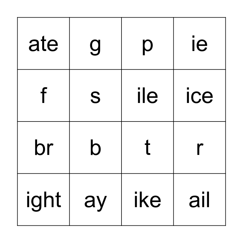 This bingo card has 17 words: ike, ight, p, ate, b, ie, r, ile, ice, s, ay, t, f, g, br, d and ail.