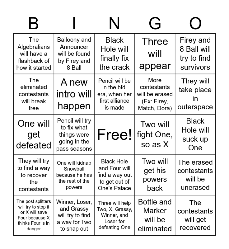 This bingo card has a free space and 24 words: One will kidnap Snowball because he has the rest of the powers, Winner, Loser, and Grassy will try to find a way for Two to snap out, Pencil will be in the bfdi era, when her first alliance is made, The post splitters will try to stop it or X will save Four because X thinks Four is in danger, Firey and 8 Ball will try to find survivors, The Algebralians will have a flashback of how it started, The eliminated contestants will break free, Balloony and Announcer will be found by Firey and 8 Ball, Two will fight One, so as X, Black Hole and Four will find a way out to get out of One's Palace, More contestants will be erased (Ex: Firey, Match, Dora), One will get defeated, Two will get his powers back, The erased contestants will be unerased, A new intro will happen, Bottle and Marker will be eliminated, Black Hole will suck up One, Black Hole will finally fix the crack, They will take place in outerspace, Pencil will try to fix what things were going in the pass seasons, The contestants will get recovered, They will try to find a way to recover the contestants, Three will appear and Three will help Two, X, Grassy, Winner, and Loser for defeating One.