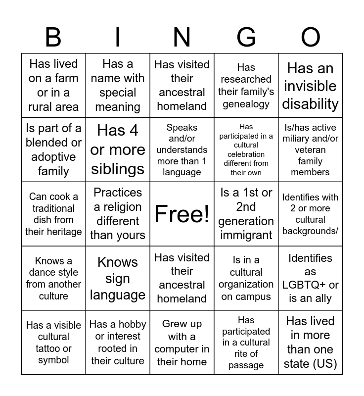 This bingo card has a free space and 24 words: Knows sign language, Has a hobby or interest rooted in their culture, Speaks and/or understands more than 1 language, Has a visible cultural tattoo or symbol, Has an invisible disability, Has lived on a farm or in a rural area, Is part of a blended or adoptive family, Has a name with special meaning, Is a 1st or 2nd generation immigrant, Has visited their ancestral homeland, Has participated in a cultural celebration different from their own, Can cook a traditional dish from their heritage, Is in a cultural organization on campus, Identifies as LGBTQ+ or is an ally, Has 4 or more siblings, Has participated in a cultural rite of passage, Identifies with 2 or more cultural backgrounds/, Has visited their ancestral homeland, Is/has active miliary and/or veteran family members, Practices a religion different than yours, Has lived in more than one state (US), Knows a dance style from another culture, Has researched their family's genealogy and Grew up with a computer in their home.