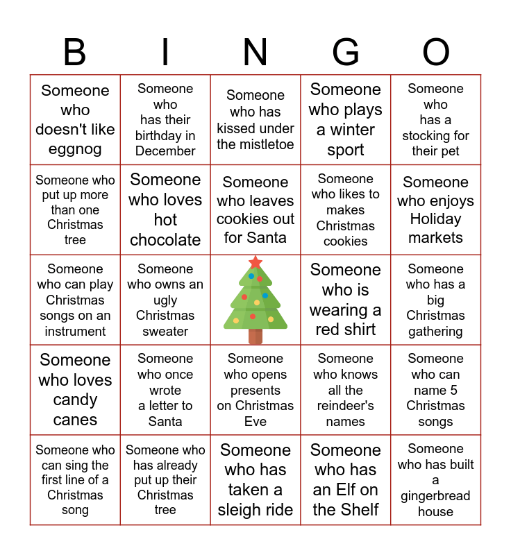 This bingo card has a free space and 24 words: Someone who once wrote a letter to Santa, Someone who has already put up their Christmas tree, Someone who leaves cookies out for Santa, Someone who can sing the first line of a Christmas song, Someone who has a stocking for their pet, Someone who doesn't like eggnog, Someone who put up more than one Christmas tree, Someone who has their birthday in December, Someone who is wearing a red shirt, Someone who opens presents on Christmas Eve, Someone who likes to makes Christmas cookies, Someone who can play Christmas songs on an instrument, Someone who knows all the reindeer's names, Someone who can name 5 Christmas songs, Someone who loves hot chocolate, Someone who has an Elf on the Shelf, Someone who has a big Christmas gathering, Someone who has kissed under the mistletoe, Someone who enjoys Holiday markets, Someone who owns an ugly Christmas sweater, Someone who has built a gingerbread house, Someone who loves candy canes, Someone who plays a winter sport and Someone who has taken a sleigh ride.