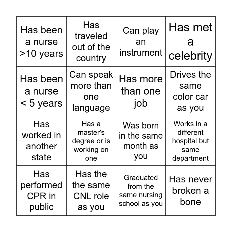 This bingo card has 16 words: Has the the same CNL role as you, Works in a different hospital but same department, Can play an instrument, Has been a nurse >10 years, Has worked in another state, Has traveled out of the country, Was born in the same month as you, Graduated from the same nursing school as you, Has been a nurse < 5 years, Can speak more than one language, Has performed CPR in public, Has met a celebrity, Has a master's degree or is working on one, Drives the same color car as you, Has more than one job and Has never broken a bone.