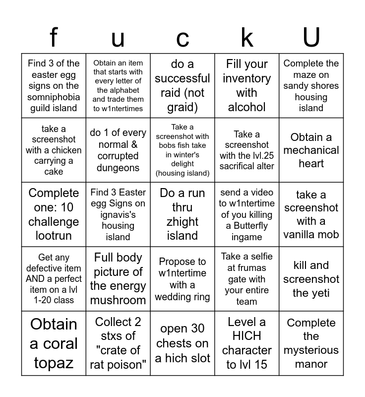 This bingo card has 25 words: Full body picture of the energy mushroom, open 30 chests on a hich slot, Take a screenshot with bobs fish take in winter's delight (housing island), Obtain a coral topaz, Complete the maze on sandy shores housing island, Find 3 of the easter egg signs on the somniphobia guild island, take a screenshot with a chicken carrying a cake, Obtain an item that starts with every letter of the alphabet and trade them to w1ntertimes, send a video to w1ntertime of you killing a Butterfly ingame, Propose to w1ntertime with a wedding ring, Take a screenshot with the lvl.25 sacrifical alter, Complete one: 10 challenge lootrun, Take a selfie at frumas gate with your entire team, kill and screenshot the yeti, do 1 of every normal & corrupted dungeons, Complete the mysterious manor, take a screenshot with a vanilla mob, do a successful raid (not graid), Obtain a mechanical heart, Find 3 Easter egg Signs on ignavis's housing island, Do a run thru zhight island, Collect 2 stxs of "crate of rat poison", Get any defective item AND a perfect item on a lvl 1-20 class, Fill your inventory with alcohol and Level a HICH character to lvl 15.