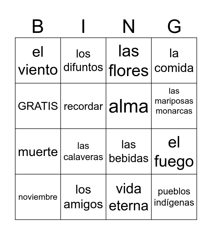 This bingo card has 44 words: el esqueleto, noviembre, celebrar, la historia, la música, la fiesta, las flores, el pan de muertos, GRATIS, las ofrendas, la comida, los amigos, los dulces, el panteón, la familia, visita, el día de los muertos, las bebidas, fotos, las calaveras, los difuntos, el papel picado, los santos, el viento, las velas, vida eterna, la noche, a rezar, el chocolate, pueblos indígenas, la vida, el baile, el agua, el aire, el fuego, la tierra, recordar, dos, las mariposas monarcas, recordar, muerte, espíritu, alma and cuerpo.