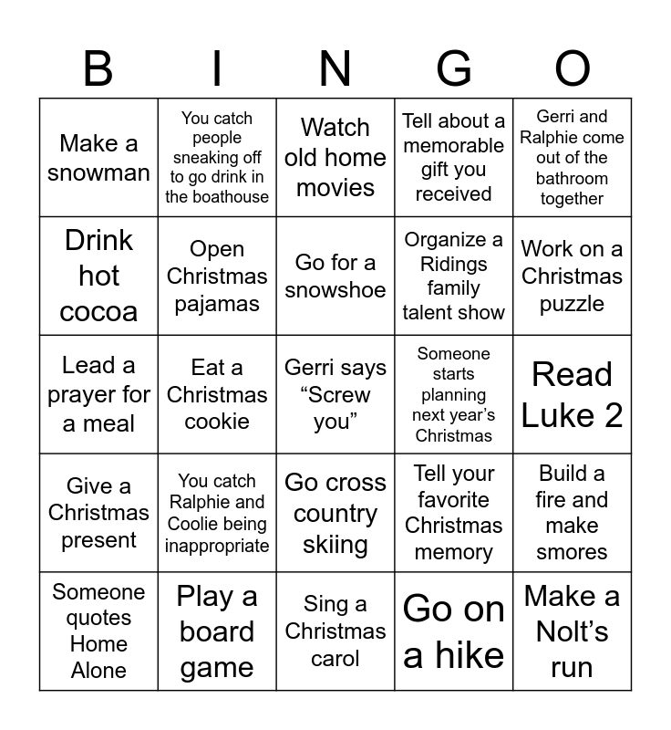 This bingo card has a free space and 29 words: Someone quotes Home Alone, Chris makes an excuse to go to town, Eat a Christmas cookie, Go to Christmas Eve service, Make a snowman, Watch old home movies, Open Christmas pajamas, You catch Ralphie and Coolie being inappropriate, Someone starts planning next year’s Christmas, Play a board game, Read Luke 2, Make a Nolt’s run, Sing a Christmas carol, Go on a hike, Work on a Christmas puzzle, You catch Brian sneaking a Christmas cookie, Go cross country skiing, Give a Christmas present, Gerri and Ralphie come out of the bathroom together, Lead a prayer for a meal, Tell your favorite Christmas memory, Put an ornament on the tree, Organize a Ridings family talent show, Drink hot cocoa, Tell about a memorable gift you received, You catch people sneaking off to go drink in the boathouse, Build a fire and make smores, Go for a snowshoe and Go out to look at the stars.