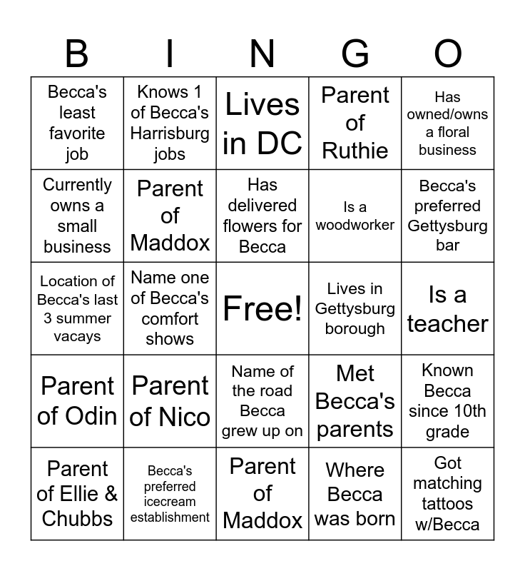 This bingo card has a free space and 38 words: Has gone to a concert with Becca, Works in the floral industry, Was roommates with Becca, Parent of Maddox, Known Becca since 10th grade, Parent of Nico, Has delivered flowers for Becca, Name either college Becca went to, Has owned/owns a floral business, Is a woodworker, Name one of Becca's comfort shows, Parent of Ruthie, Got matching tattoos w/Becca, Is a teacher, Currently owns a small business, Parent of Odin, Name all of Becca's siblings, Lives in DC, Played a boardgame with Becca, Lives in Gettysburg borough, Becca's least favorite job, Becca's preferred icecream establishment, Becca's preferred Gettysburg bar, Parent of Ellie & Chubbs, Parent of Roy & Bo, Parent of Maddox, Parent of Peanut, Knows how old Becca is turning, Parent of Sunny, Knows Becca's next tattoo plan, Worked at Waldo's, Name of the road Becca grew up on, Where Becca was born, Knows 1 of Becca's Harrisburg jobs, Gone thrifting with Becca, Met Becca's parents, Location of Becca's last 3 summer vacays and Been to Locaflora.