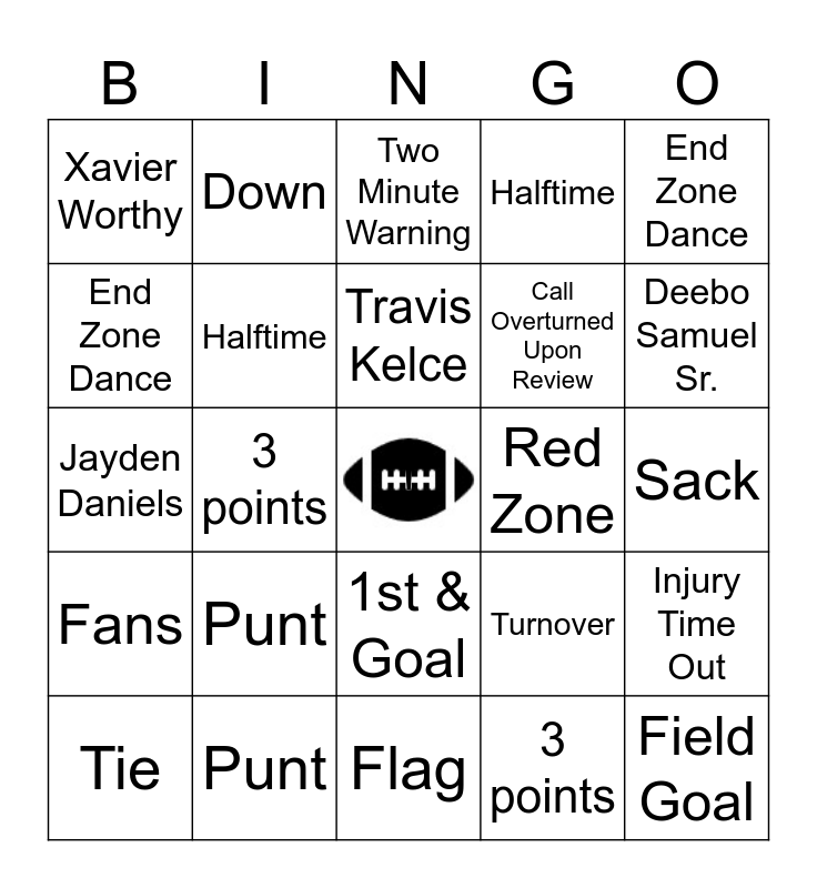 ⚠ This card has duplicate items: Red Zone (2), Commercial (3), 1st & Goal (2), Washington Commanders (2), Down (2), Taylor Swift (2), Timeout (2), 2 Point Conversion (2), Patrick Mahomes (2), Field Goal (4), Offsides (2), Injury Time Out (2), Sack (2), Missed Field Goal (2), Travis Kelce (2), Chiefs Touchdown (2), Fumble (2), Interception (2), Andy Reid (2), End of Quarter (2), QB Touchdown Run (2), Flag (2), Foul (2), Jayden Daniels (2), Punt (2), Camera on the Team Owner (2), Kansas City Chiefs (2), Call Overturned Upon Review (2), Halftime (2), 3 points (2), Commanders Touchdown (2), Xavier Worthy (2), Final Score (2), Two Minute Warning (2), End Zone Dance (2), Reversed Call (2), Deebo Samuel Sr. (2), Tie (2), Fans (2), Arrowhead (2), Dan Quinn (2), 4th Down (2), Turnover (2)