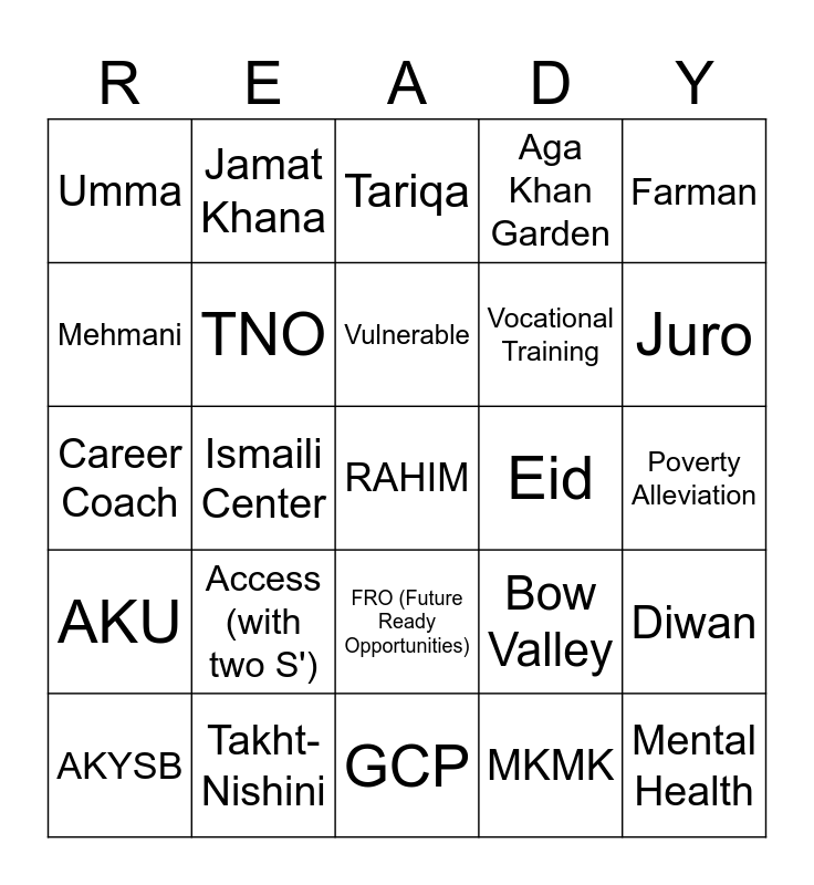 This bingo card has a free space and 71 words: Imamat, Jamat Khana, Dua, Ginan, Juro, Seva, Ismaili Center, Navroz, Eid, Sucrit, AKU, DII, GCP, Aga Khan Garden, Aga Khan Park, Umma, Bayah, Tariqa, Talim, Farman, Mehmani, Takht-Nishini, IVC, MKMK, FOCUS, Mentor, Bait-ul-Ilm, Global Encounters, Imara, Al-Akbhar, AKYSB, Civic, Navigator, Case Manager, Poverty Alleviation, COPE, Social Services, Livelihoods, Vocational Training, Mental Health, Career Coach, NEM, JK Rep, PC&T (People Culture and Training), Senior Navigator, Communications, FRI, Vulnerable, Crisis Support, Isfand, Service Excellence, LCM, Partnerships, Bow Valley, Durham College, Acces (yes with one S), Access (with two S'), Achev, Credential Evaluation, WES, Intake, Goals, FRO (Future Ready Opportunities), Monitoring & Evaluation, Data Strategy, OJCMS, TNO, Economic Planning Board, Shia, Diwan and Al Azhar.