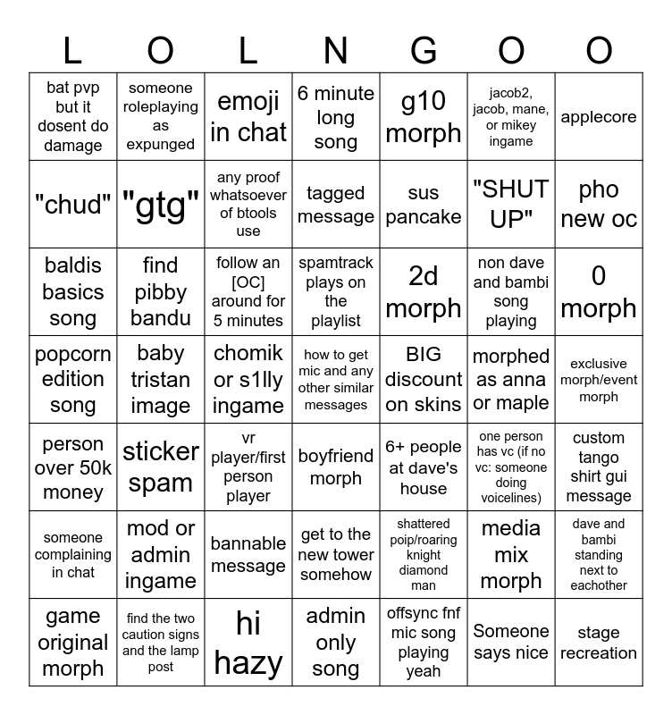 This bingo card has 49 words: media mix morph, "SHUT UP", offsync fnf mic song playing yeah, baby tristan image, follow an [OC] around for 5 minutes, exclusive morph/event morph, someone roleplaying as expunged, hi hazy, jacob2, jacob, mane, or mikey ingame, boyfriend morph, applecore, 6 minute long song, non dave and bambi song playing, 2d morph, mod or admin ingame, morphed as anna or maple, "chud", pho new oc, dave and bambi standing next to eachother, g10 morph, sus pancake, chomik or s1lly ingame, bat pvp but it dosent do damage, "gtg", game original morph, any proof whatsoever of btools use, 0 morph, find the two caution signs and the lamp post, spamtrack plays on the playlist, find pibby bandu, stage recreation, BIG discount on skins, someone complaining in chat, bannable message, popcorn edition song, 6+ people at dave's house, one person has vc (if no vc: someone doing voicelines), custom tango shirt gui message, baldis basics song, vr player/first person player, get to the new tower somehow, person over 50k money, how to get mic and any other similar messages, admin only song, tagged message, emoji in chat, shattered poip/roaring knight diamond man, sticker spam and Someone says nice.