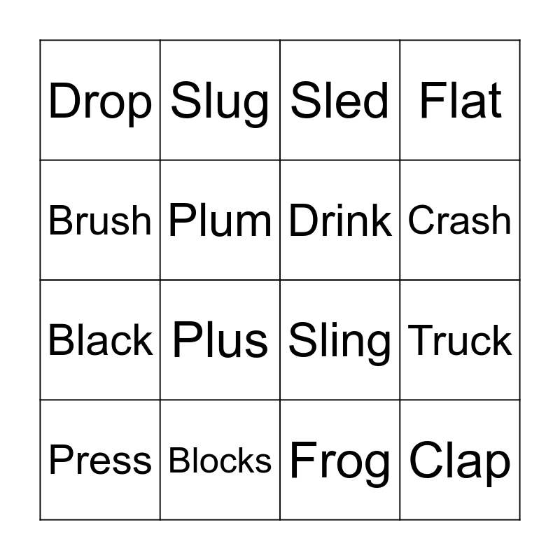 This bingo card has 28 words: Flag, Glass, Black, Clock, Plum, Sled, Slug, Clap, Blocks, Plant, Sling, Flat, Crib, Floss, Plus, Trip, Trick, Drink, Crash, Drip, Drop, Grill, Press, Truck, Frog, Drum, Brush and Crack.