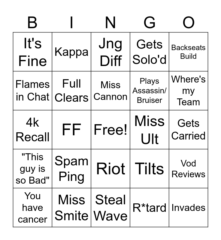 This bingo card has a free space and 24 words: You have cancer, Spam Ping, Miss Cannon, R*tard, Backseats Build, It's Fine, Kappa, Jng Diff, Miss Ult, Gets Carried, 4k Recall, Full Clears, Tilts, Vod Reviews, Flames in Chat, Miss Smite, Steal Wave, Gets Solo'd, Where's my Team, "This guy is so Bad", FF, Riot, Plays Assassin/ Bruiser and Invades.