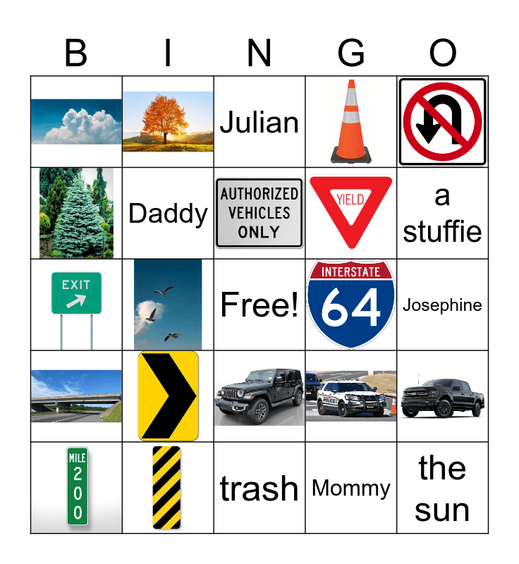 This bingo card has 17 images, a free space and 7 words: Daddy, Mommy, Josephine, Julian, a stuffie, the sun and trash.