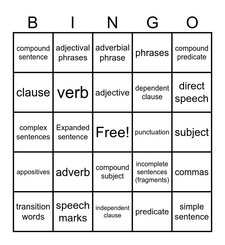 This bingo card has a free space and 27 words: incomplete sentences (fragments), run-on sentences, dependent clause, independent clause, clause, adverbial phrase, adjectival phrases, appositives, punctuation, commas, complex sentences, phrases, transition words, speech marks, direct speech, noun, verb, adjective, adverb, compound sentence, subject, predicate, Expanded sentence, simple sentence, compound subject, compound predicate and sentence structures.