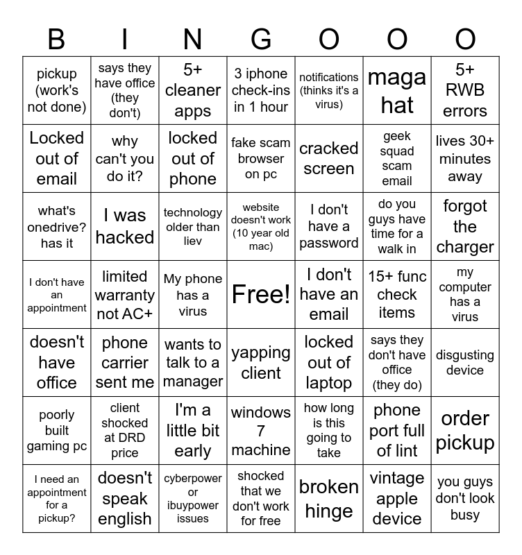 This bingo card has a free space and 58 words: Are you a geek?, I don't have an appointment, can I drop this off?, I was hacked, My phone has a virus, how long is this going to take, 5+ RWB errors, call center said, why can't you do it?, phone port full of lint, 3 iphone check-ins in 1 hour, client shocked at DRD price, wants to talk to a manager, phone carrier sent me, shocked that we don't work for free, pickup (work's not done), geek squad scam email, notifications (thinks it's a virus), I have total (they don't), Locked out of email, lives 30+ minutes away, 5+ cleaner apps, forgot the charger, do you guys have time for a walk in, outlook problems, what's onedrive? has it, my computer has a virus, I can't wait 2 days/weeks/hours, locked out of phone, locked out of laptop, I don't have a lot of data, poorly built gaming pc, cyberpower or ibuypower issues, broken hinge, I don't have an email, yapping client, I'm a little bit early, cracked screen, fake scam browser on pc, windows 7 machine, technology older than liev, you guys don't look busy, I don't have a password, doesn't bring phone, order pickup, I need an appointment for a pickup?, doesn't speak english, website doesn't work (10 year old mac), limited warranty not AC+, vintage apple device, disgusting device, 15+ func check items, doesn't have office, says they don't have office (they do), says they have office (they don't), ex is spying on me, maga hat and I wasn't told that.