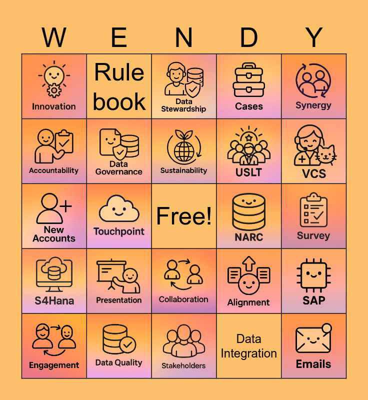 This bingo card has 26 images, a free space and 2 words: Data Integration and Rule book.