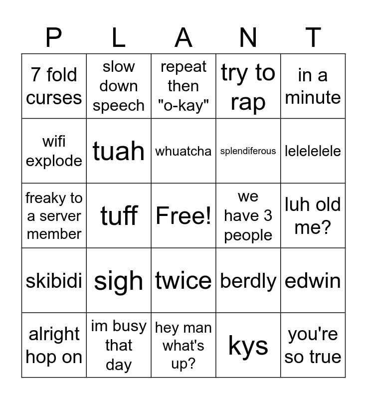 This bingo card has a free space and 27 words: berdly, am i mutted, splendiferous, hey man what's up?, wifi explode, repeat then "o-kay", slow down speech, skibidi, we have 3 people, edwin, freaky to a server member, try to rap, alright hop on, im busy that day, lelelelele, this reminds me of deltarune, tuah, whuatcha, sigh, 7 fold curses, luh old me?, kys, tuff, you're so true, twice, in a minute and gourd.