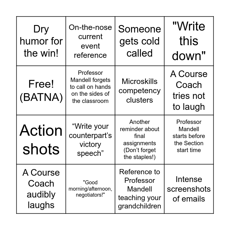 This bingo card has 16 words: "Good morning/afternoon, negotiators!", Professor Mandell starts before the Section start time, Someone gets cold called, Dry humor for the win!, Action shots, On-the-nose current event reference, Another reminder about final assignments (Don’t forget the staples!), Reference to Professor Mandell teaching your grandchildren, Free! (BATNA), Professor Mandell forgets to call on hands on the sides of the classroom, A Course Coach audibly laughs, "Write this down", “Write your counterpart’s victory speech”, A Course Coach tries not to laugh, Microskills competency clusters and Intense screenshots of emails.