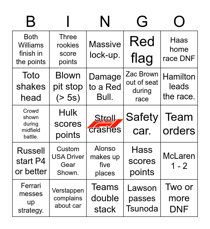 This bingo card has a free space and 34 words: Penalty Given., Lawson passes Tsunoda, Hamilton complains about his tires., McLaren boys make contact, Russell start P4 or better, Blown pit stop (> 5s), Haas home race DNF, Ferrari messes up strategy., Three rookies score points, Camera shows Ocon., Damage to a Red Bull., Massive lock-up., Commentators tell Texas / America-related joke., Incident in first corner., Safety car., Hamilton leads the race., Verstappen complains about car, Crowd shown during midfield battle., Custom USA Driver Gear Shown., Hass scores points, Alonso makes up five places, Camera shows diehard Haas fans., Both Williams finish in the points, Team orders, Teams double stack, Two or more DNF, Red flag, Wing replaced, Zac Brown out of seat during race, Toto shakes head, Kimi gets ahead of Hamilton, Hulk scores points, McLaren 1 - 2 and Verstappen misses podium.