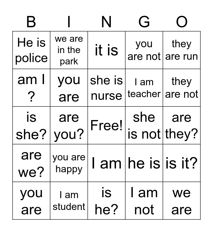 This bingo card has a free space and 24 words: you are happy, I am student, she is nurse, you are, they are run, He is police, am I ?, we are in the park, she is not, I am, I am teacher, is she?, he is, is it?, you are, I am not, are they?, it is, they are not, are you?, we are, are we?, you are not and is he?.