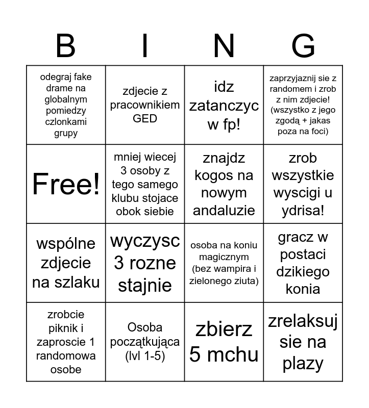 This bingo card has 16 words: Osoba początkująca (lvl 1-5), gracz w postaci dzikiego konia, idz zatanczyc w fp!, odegraj fake drame na globalnym pomiedzy czlonkami grupy, wspólne zdjecie na szlaku, zdjecie z pracownikiem GED, osoba na koniu magicznym (bez wampira i zielonego ziuta), zbierz 5 mchu, Free!, mniej wiecej 3 osoby z tego samego klubu stojace obok siebie, zrobcie piknik i zaproscie 1 randomowa osobe, zaprzyjaznij sie z randomem i zrob z nim zdjecie! (wszystko z jego zgodą + jakas poza na foci), wyczysc 3 rozne stajnie, zrob wszystkie wyscigi u ydrisa!, znajdz kogos na nowym andaluzie and zrelaksuj sie na plazy.