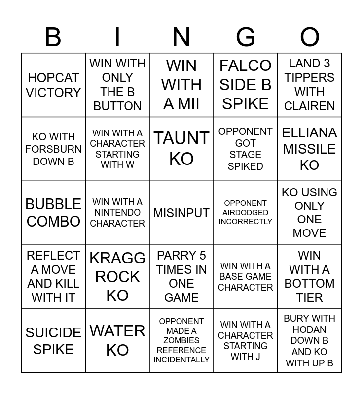 This bingo card has a free space and 146 words: WIN WITH A SMASH BROS ADJACENT CHARACTER, KO WITH ETALUS UP AIR SPIKE, WIN WITH A POKÉMON CHARACTER, WIN WITH A MARIO CHARACTER, GET PARRIED, WIN WITH A BASE GAME CHARACTER, WIN WITH A WORKSHOP OC, WIN WITH A STOCK DEFICIT, THREE STOCK, WIN WITH A ZELDA CHARACTER, WIN WITH A CHARACTER BASED ON AN ALREADY EXISTING MEDIA, KO WITH JAB, CHEESE SOMEONE, FOOTSTOOL OFFSTAGE, WIN WITH ONLY THE A BUTTON, WIN WITH A SONIC CHARACTER, ZERO TO DEATH, WIN WITH A TOP TIER, WIN WITH WORKSHOP RANDOM, WIN WITH A VIDEO GAME CHARACTER NOT IN SMASH, SURVIVE TO 200%, WIN WITH A BOTTOM TIER, WIN WITH BASE GAME RANDOM, WIN WITH A MID TIER, GET CHEESED, WIN WITH A NINTENDO CHARACTER, WIN WITH ONLY THE B BUTTON, LAND A FULLY CHARGED SMASH ATTACK, OPPONENT SD’D UNDER 50%, LAND 5 SPIKES IN TOTAL, LAND A GAME AND WATCH 9, FALCON PUNCH!, GET A KO ON SOMEONE UNDER 60%, KO USING ONLY ONE MOVE, KO WITH REST, WIN WITHOUT JUMPING, WIN WITHOUT JUMPING, KO WITH MARIO CAPE OFFSTAGE, OPPONENT GOT STAGE SPIKED, FIRST BLOOD, KO WITH KIRBY COPY ABILITY, DO 10 TAUNTS IN ONE GAME, PARRY 5 TIMES IN ONE GAME, HARD READ, KO WITH REST, GET TO 69 OR 115%, KO WITH JIGGLYPUFF ROLLOUT, LAND 3 COUNTERS IN ONE GAME, BURY THE OPPONENT, KO WITH A POCKETED ITEM, KO WITH YOUR UP B, DOUBLE DIP, SUICIDE SPIKE, PLAY A PROJECTILE CHARACTER AND WIN WITHOUT USING PROJECTILES, NESS UP B ROCKET, COMPLAIN, RECOVER WITH BOMB/C4, WIN WITHOUT USING A SMASH ATTACK, WIN A GAME IN THREE MINUTES, KO WITH LUIGI UP B, WIN WITH A MII, MARIO FORWARD AERIAL, KO WITH WAFT, BE HYPE, WIN WITH BLUE KIRBY, OPPONENT AIRDODGED INCORRECTLY, REFLECT A MOVE AND KILL WITH IT, KO WITH TREE, DISRESPECT, SAVE SOMEONE FROM A TRAGIC SD, HIT EVERY MOVE IN A SINGLE GAME, SHINE “SPIKE”, HOPCAT VICTORY, KO WITH EGG ROLL, SUCCESSFUL EDGEGUARD, KILL WITH GAME AND WATCH BUCKET, ELECTRIC KO, WII FIT TRAINER FAIR SPIKE, “YOU’RE DEAD?!?” UNIRONICALLY, FALCO SIDE B SPIKE, WIN WITH A LIGHTWEIGHT, GET CUTSCENED, WIN WITH A HEAVY, KO WITH FTILT, WIN WITHOUT USING A SINGLE AERIAL, CARRY OFF THE TOP WITH UP B, MAKE OTHER PLAYER HAVE NO FUN, GO UNDER THE STAGE AND MAKE IT WITHOUT DYING, MOVE KILLED EARLY FOR NO REASON, OPPONENT MADE A ZOMBIES REFERENCE INCIDENTALLY, BAD DI, KO WITH ELLIANA UP B, KO WITH WRASTOR UP B, FIRE KO, WATER KO, EARTH KO, LAND SD-V'S DOWN B, ITEM KO, BUBBLE COMBO, DRAGDOWN KILL CONFIRM, WIN WITH A CHARACTER WHO IS COMPLETELY UNFAMILIAR, KO WITH FORSBURN DOWN B, ZETTERBURN SHINE UP SMASH, KO WITH ORI BASH, BUY SHOVEL KNIGHT GOLD ARMOR THEN WIN, TAUNT KO, KO WITH ORCANE UP B, FREEZE THE OPPONENT 3 TIMES, KO WITH OLYMPIA UP AIR SPIKE, COVER THE ENTIRE STAGE WITH SYLVANOS GRASS, KO WITH WRASTOR TORNADO, KRAGG ROCK KO, AERIAL SMASH ATTACK KILL, ELLIANA MISSILE KO, MOLLO BOMB KO, BURY WITH HODAN DOWN B AND KO WITH UP B, LAND 3 TIPPERS WITH CLAIREN, COMBO FROM MAYPUL WRAPPING, KO WITH ABSA NEUTRAL B, WIN WITH A CHARACTER STARTING WITH A, WIN WITH A CHARACTER STARTING WITH B, WIN WITH A CHARACTER STARTING WITH C, WIN WITH A CHARACTER STARTING WITH D, WIN WITH A CHARACTER STARTING WITH E, WIN WITH A CHARACTER STARTING WITH J, WIN WITH A CHARACTER STARTING WITH I, WIN WITH A CHARACTER STARTING WITH H, WIN WITH A CHARACTER STARTING WITH G, WIN WITH A CHARACTER STARTING WITH F, WIN WITH A CHARACTER STARTING WITH K, WIN WITH A CHARACTER STARTING WITH L, WIN WITH A CHARACTER STARTING WITH M, WIN WITH A CHARACTER STARTING WITH N, WIN WITH A CHARACTER STARTING WITH O, WIN WITH A CHARACTER STARTING WITH T, WIN WITH A CHARACTER STARTING WITH S, WIN WITH A CHARACTER STARTING WITH R, WIN WITH A CHARACTER STARTING WITH Q, WIN WITH A CHARACTER STARTING WITH P, WIN WITH A CHARACTER STARTING WITH U, WIN WITH A CHARACTER STARTING WITH V, WIN WITH A CHARACTER STARTING WITH W, WIN WITH A CHARACTER STARTING WITH X, WIN WITH A CHARACTER STARTING WITH Y, WIN WITH A CHARACTER STARTING WITH Z and WIN WITH A CHARACTER STARTING WITH A NUMBER.