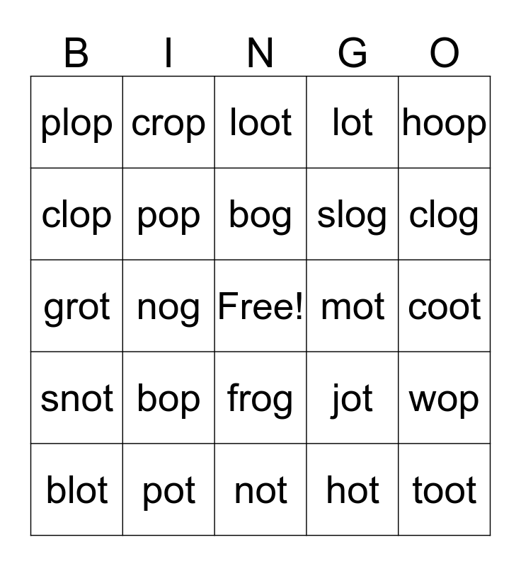 This bingo card has a free space and 24 words: bop, pot, bog, blot, hoop, plop, clop, crop, mot, frog, slog, grot, jot, wop, pop, hot, coot, loot, clog, nog, toot, snot, lot and not.