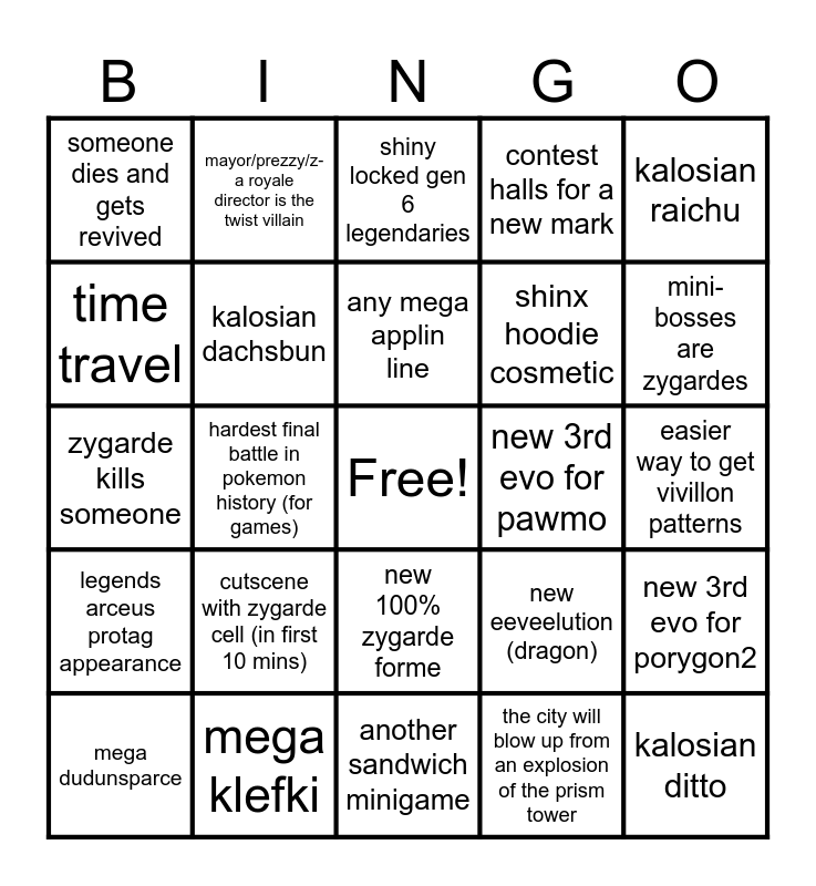 This bingo card has a free space and 24 words: cutscene with zygarde cell (in first 10 mins), mega klefki, any mega applin line, mega dudunsparce, kalosian raichu, someone dies and gets revived, time travel, mayor/prezzy/z-a royale director is the twist villain, new 3rd evo for pawmo, new 100% zygarde forme, shinx hoodie cosmetic, zygarde kills someone, new eeveelution (dragon), new 3rd evo for porygon2, kalosian dachsbun, the city will blow up from an explosion of the prism tower, easier way to get vivillon patterns, shiny locked gen 6 legendaries, mini-bosses are zygardes, hardest final battle in pokemon history (for games), kalosian ditto, legends arceus protag appearance, contest halls for a new mark and another sandwich minigame.