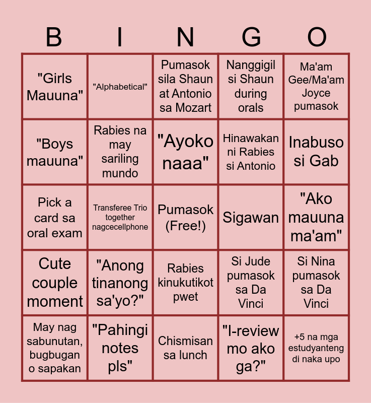 This bingo card has a free space and 24 words: "Anong tinanong sa'yo?", "Pahingi notes pls", "Ayoko naaa", May nag sabunutan, bugbugan o sapakan, Ma'am Gee/Ma'am Joyce pumasok, "Girls Mauuna", "Boys mauuna", "Alphabetical", Sigawan, Rabies kinukutikot pwet, Hinawakan ni Rabies si Antonio, Pick a card sa oral exam, Si Jude pumasok sa Da Vinci, Si Nina pumasok sa Da Vinci, Rabies na may sariling mundo, "I-review mo ako ga?", "Ako mauuna ma'am", Pumasok sila Shaun at Antonio sa Mozart, Inabuso si Gab, Transferee Trio together nagcecellphone, +5 na mga estudyanteng di naka upo, Cute couple moment, Nanggigil si Shaun during orals and Chismisan sa lunch.