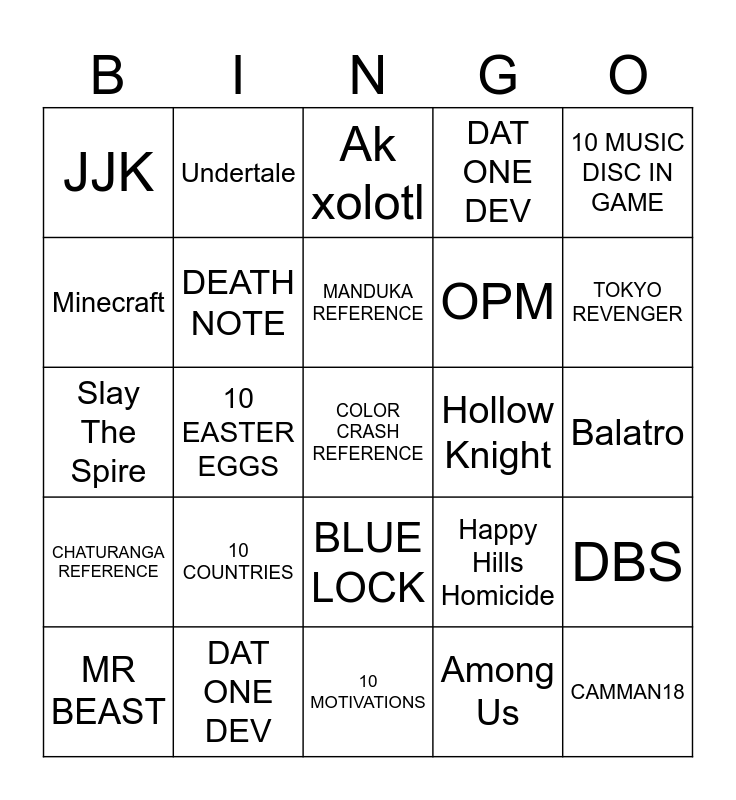 This bingo card has a free space and 24 words: 10 COUNTRIES, DAT ONE DEV, MANDUKA REFERENCE, MR BEAST, 10 MUSIC DISC IN GAME, JJK, Minecraft, Undertale, Hollow Knight, BLUE LOCK, OPM, Slay The Spire, Happy Hills Homicide, DBS, DEATH NOTE, Among Us, Balatro, Ak xolotl, TOKYO REVENGER, 10 EASTER EGGS, CAMMAN18, CHATURANGA REFERENCE, DAT ONE DEV and 10 MOTIVATIONS.