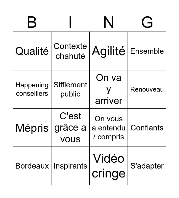 This bingo card has 16 words: Inspirants, Confiants, Agilité, Qualité, Mépris, Contexte chahuté, On vous a entendu / compris, Vidéo cringe, Happening conseillers, Sifflement public, Bordeaux, Ensemble, C'est grâce a vous, Renouveau, On va y arriver and S'adapter.