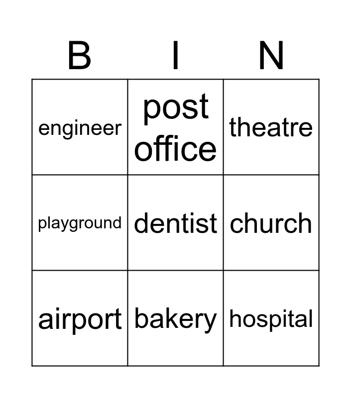 This bingo card has a free space and 8 words: church, theatre, post office, airport, engineer, hospital, playground and bakery.