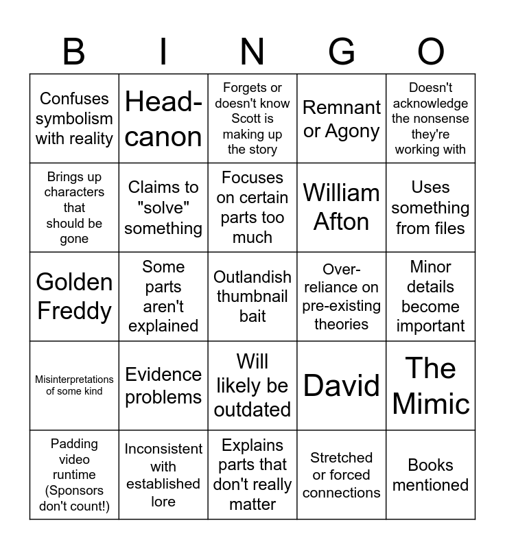 This bingo card has a free space and 24 words: Evidence problems, Inconsistent with established lore, Focuses on certain parts too much, Padding video runtime (Sponsors don't count!), Doesn't acknowledge the nonsense they're working with, Confuses symbolism with reality, Brings up characters that should be gone, Head-canon, Over- reliance on pre-existing theories, Will likely be outdated, William Afton, Golden Freddy, David, The Mimic, Claims to "solve" something, Stretched or forced connections, Minor details become important, Forgets or doesn't know Scott is making up the story, Uses something from files, Some parts aren't explained, Books mentioned, Misinterpretations of some kind, Remnant or Agony and Explains parts that don't really matter.