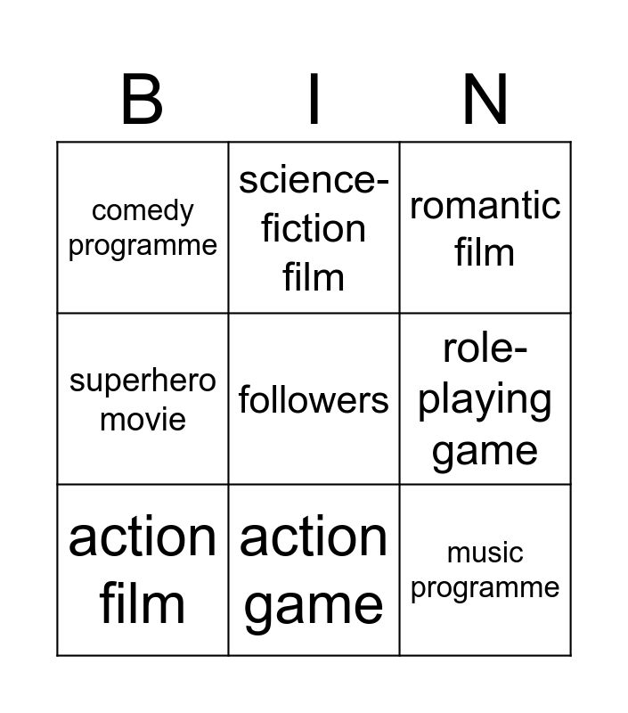 This bingo card has 28 words: Free!, musical, music programme, neighbourhood, role-playing game, romantic film, science-fiction film, shy, sports game, sports programme, strategy game, superhero movie, talent show, thriller, travel show, twins, upload, action film, action game, cartoon, comedy programme, console, construction game, cookery programme, documentary, drama series, followers and horror film.