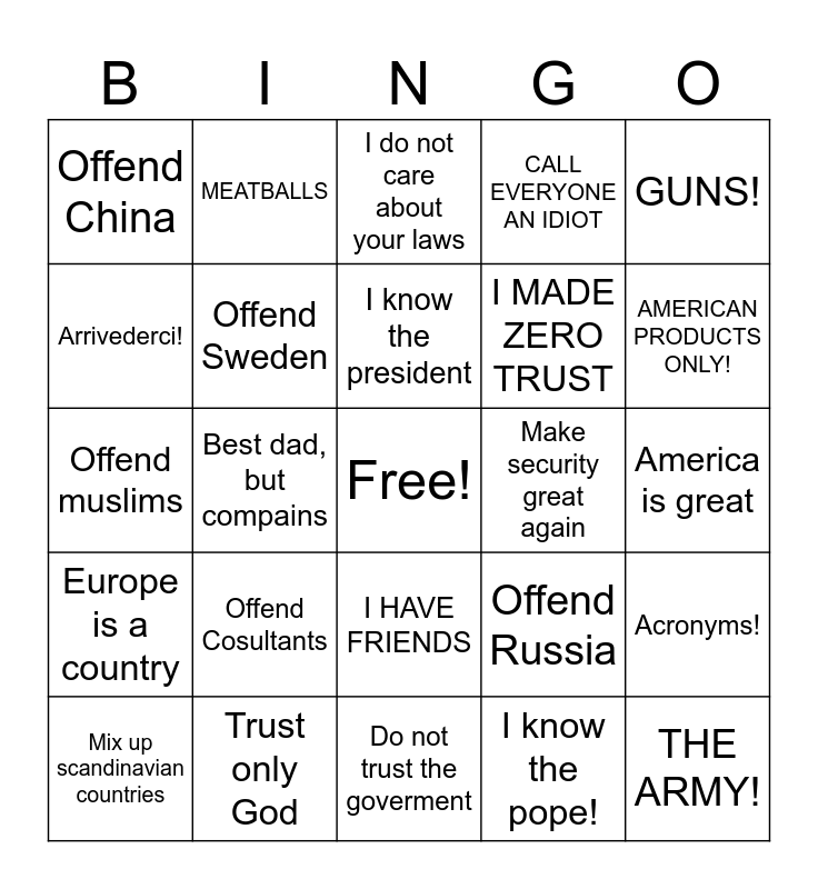 This bingo card has a free space and 24 words: Offend Cosultants, Trust only God, I know the president, Mix up scandinavian countries, GUNS!, Offend China, Arrivederci!, MEATBALLS, Make security great again, I HAVE FRIENDS, I MADE ZERO TRUST, Offend muslims, Offend Russia, Acronyms!, Offend Sweden, I know the pope!, America is great, I do not care about your laws, AMERICAN PRODUCTS ONLY!, Best dad, but compains, THE ARMY!, Europe is a country, CALL EVERYONE AN IDIOT and Do not trust the goverment.