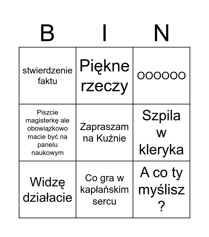 This bingo card has a free space and 8 words: Szpila w kleryka, OOOOOO, Piękne rzeczy, Widzę działacie, stwierdzenie faktu, A co ty myślisz ?, Piszcie magisterkę ale obowiązkowo macie być na panelu naukowym and Co gra w kapłańskim sercu.