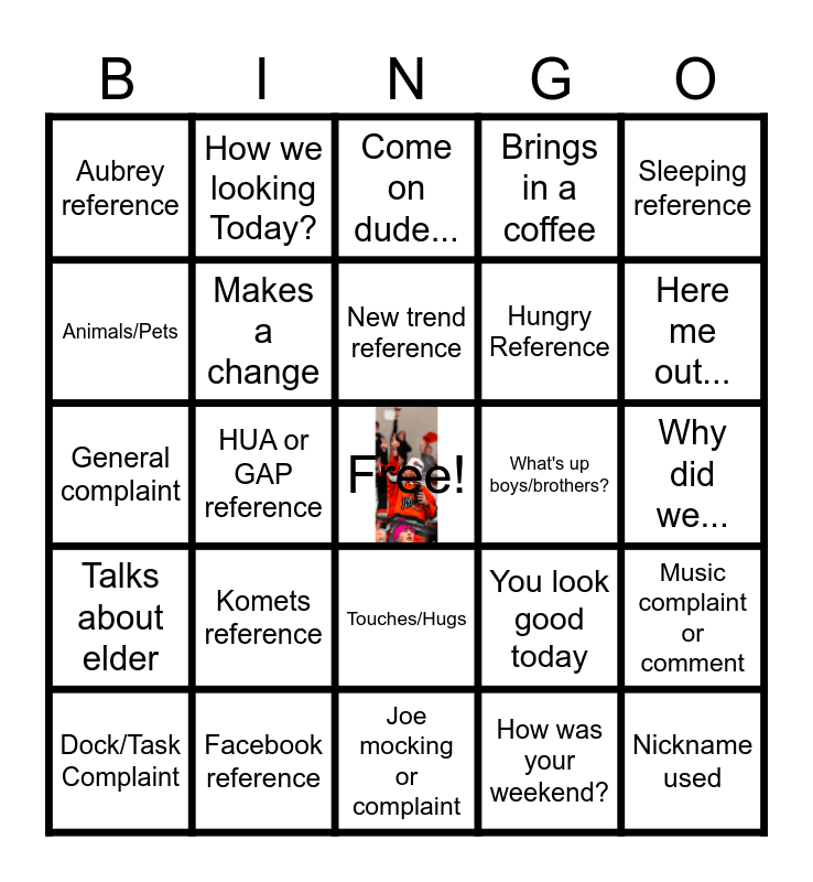 This bingo card has a free space and 24 words: Komets reference, Facebook reference, New trend reference, Dock/Task Complaint, Sleeping reference, Aubrey reference, Animals/Pets, How we looking Today?, What's up boys/brothers?, Touches/Hugs, Hungry Reference, General complaint, You look good today, Music complaint or comment, Makes a change, How was your weekend?, Why did we..., Come on dude..., Here me out..., HUA or GAP reference, Nickname used, Talks about elder, Brings in a coffee and Joe mocking or complaint.