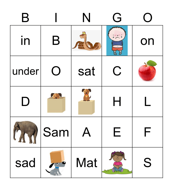 This bingo card has 8 images and 17 words: Sam, Mat, sat, sad, on, in, under, B, H, A, C, D, E, F, O, S and L.