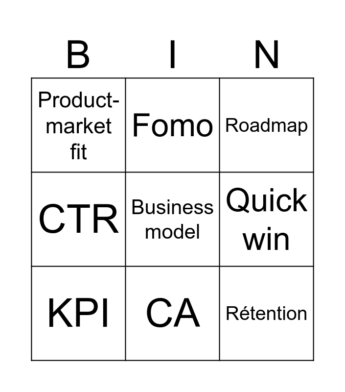 This bingo card has 9 words: KPI, Roadmap, Fomo, CTR, Product-market fit, Quick win, Business model, Rétention and CA.
