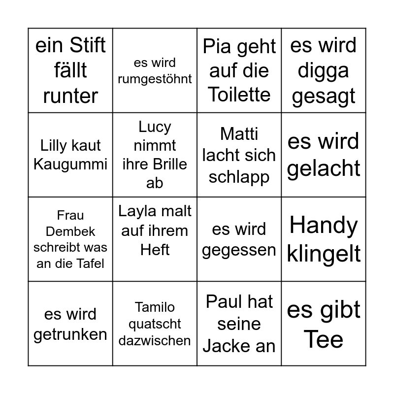 This bingo card has 16 words: Tamilo quatscht dazwischen, Handy klingelt, Pia geht auf die Toilette, ein Stift fällt runter, Frau Dembek schreibt was an die Tafel, es wird rumgestöhnt, es wird gegessen, Paul hat seine Jacke an, Lilly kaut Kaugummi, Lucy nimmt ihre Brille ab, es wird getrunken, es wird digga gesagt, Layla malt auf ihrem Heft, es wird gelacht, Matti lacht sich schlapp and es gibt Tee.