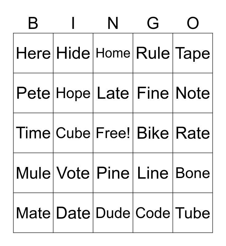 This bingo card has a free space and 24 words: Vote, Date, Late, Mate, Tape, Here, Pete, Hide, Bike, Pine, Fine, Time, Line, Bone, Hope, Code, Rate, Home, Note, Cube, Tube, Mule, Rule and Dude.