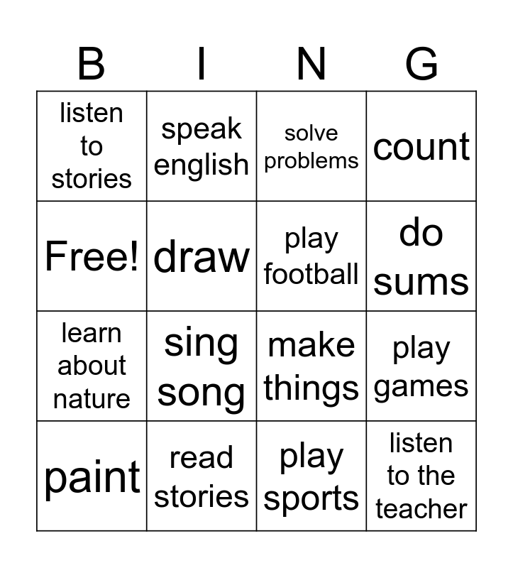 This bingo card has 16 words: read stories, play games, solve problems, listen to stories, learn about nature, speak english, make things, play sports, Free!, draw, paint, count, sing song, do sums, play football and listen to the teacher.
