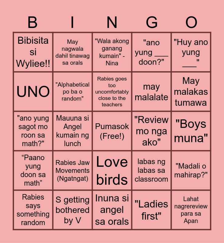 This bingo card has a free space and 24 words: Rabies Jaw Movements (Ngatngat), S getting bothered by V, Rabies goes too uncomfortably close to the teachers, Rabies says something random, "Huy ano yung ___", Bibisita si Wyliee!!, UNO, May nagwala dahil tinawag sa orals, "Review mo nga ako", Love birds, may malalate, "ano yung sagot mo roon sa math?", labas ng labas sa classroom, "Madali o mahirap?", "Alphabetical po ba o random", "Ladies first", "Boys muna", "Wala akong ganang kumain" -Nina, May malakas tumawa, Mauuna si Angel kumain ng lunch, Lahat nagrereview para sa Apan, “Paano yung doon sa math”, "ano yung ___ doon?" and Inuna si angel sa orals.