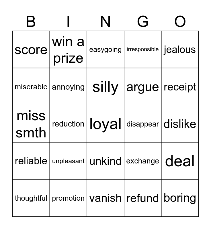 This bingo card has a free space and 34 words: Charge, refund, discount, online shopping, reliable, annoying, jealous, thoughtful, win a prize, serve, silly, easygoing, lose a game, unlucky, disappear, receipt, promotion, miss smth, unpleasant, exchange, unkind, sensible, score, dislike, vanish, boring, irresponsible, dull, argue, miserable, go away, reduction, deal and envious.