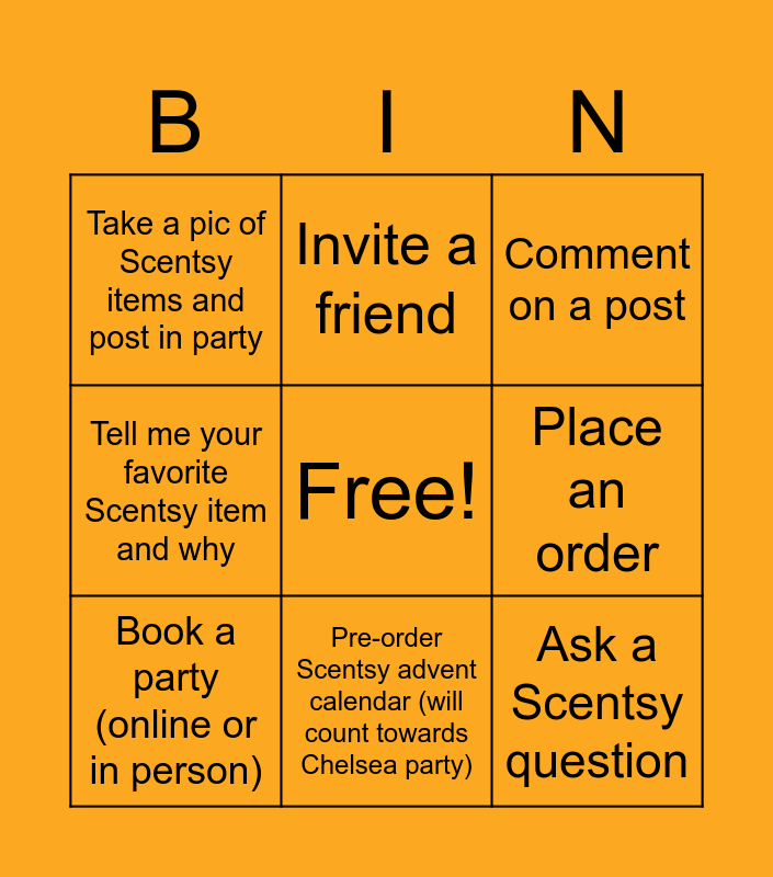 This bingo card has a free space and 8 words: Place an order, Comment on a post, Invite a friend, Book a party (online or in person), Take a pic of Scentsy items and post in party, Ask a Scentsy question, Tell me your favorite Scentsy item and why and Pre-order Scentsy advent calendar (will count towards Chelsea party).