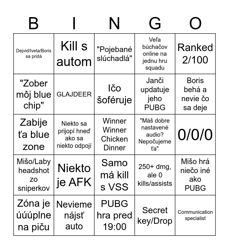 This bingo card has a free space and 24 words: Niekto je AFK, Nevieme nájsť auto, Ičo šoféruje, Zóna je úúúplne na piču, Ranked 2/100, Dejvid/Iveta/Boris sa pridá, "Zober môj blue chip", Kill s autom, "Máš dobre nastavené audio? Nepočujeme ťa", Samo má kill s VSS, Janči updatuje jeho PUBG, Zabije ťa blue zone, 250+ dmg, ale 0 kills/assists, Mišo hrá niečo iné ako PUBG, GLAJDEER, Secret key/Drop, 0/0/0, "Pojebané slúchadlá", Boris behá a nevie čo sa deje, Niekto sa prijopí hneď ako sa niekto odpojí, Communication specialist, Mišo/Laby headshot zo sniperkov, Veľa búchačov online na jednu hru squadu and PUBG hra pred 19:00.